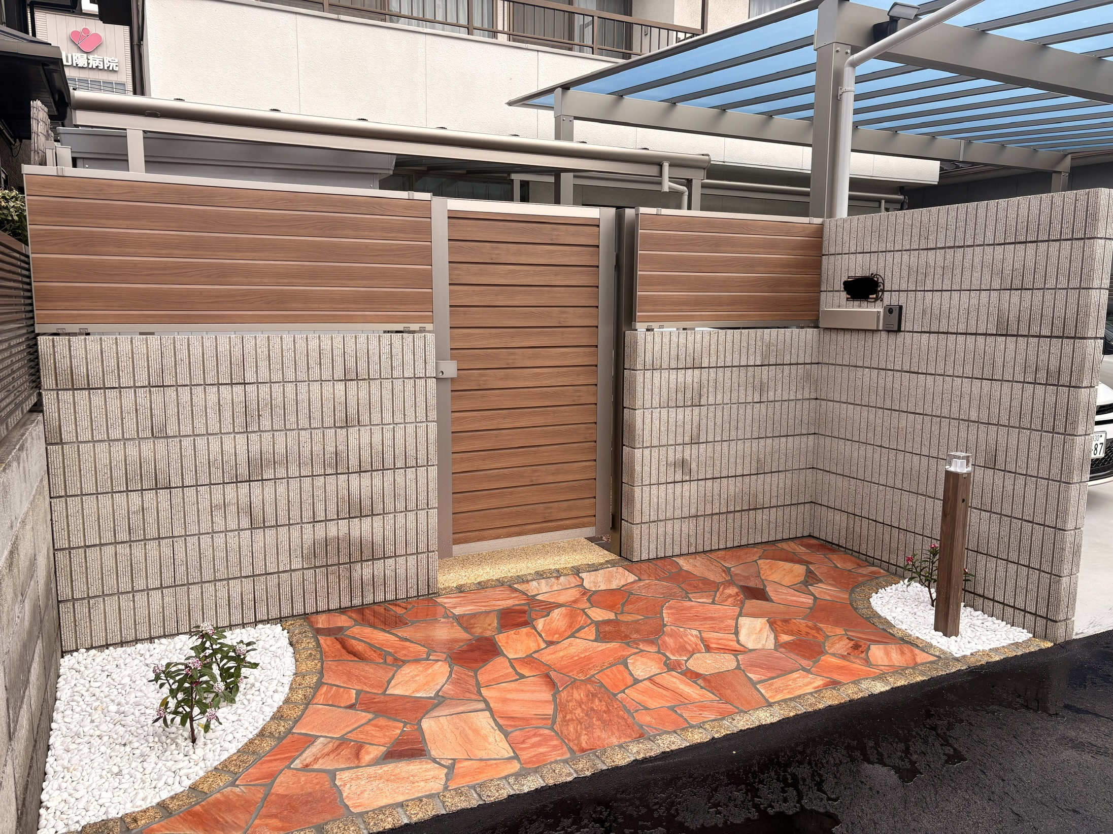 門袖 アプローチ乱石貼り 門扉を施工いたしました。